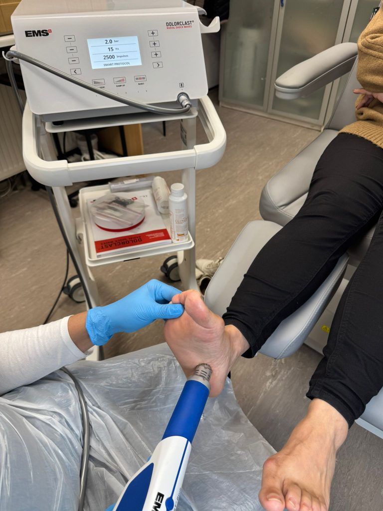Shockwave Therapy is an advanced, non-invasive treatment designed to relieve pain and promote healing in chronic musculoskeletal conditions. At Longwood Foot Clinic in Ilford, we use Extracorporeal Radial Shockwave Therapy (ESWT) with the EMS DolorClast® Radial Shock Waves system. It is a clinically proven treatment that delivers targeted, high-energy acoustic waves to the affected area, helping to stimulate blood circulation, encourage tissue repair, and reduce long-standing discomfort. As a completely non-invasive approach, it works externally on the body without the need for injections or surgery, making it a safe and effective option for treating a range of musculoskeletal injuries.